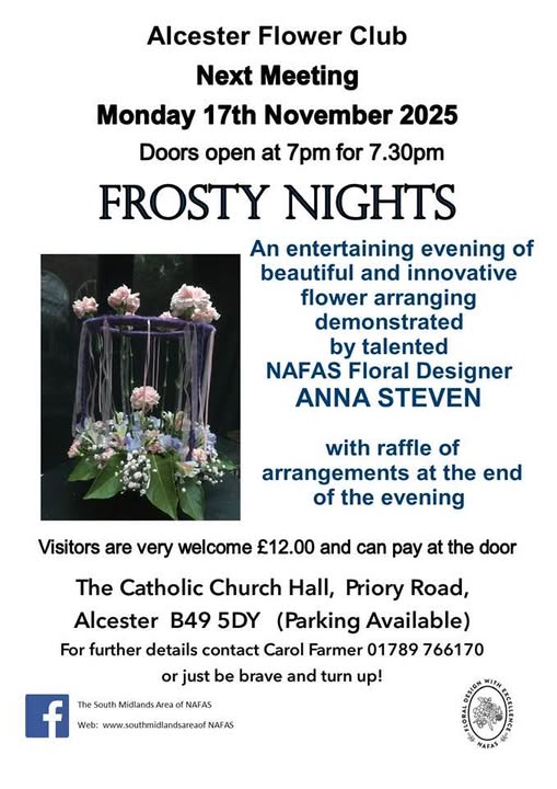 AlcesterAlauna Event Details Date: 17/11/2025 7:30 pm – 9:00 pm Venue: The Catholic Church HallTicket Price: £12Contact name: Telephone: Email: Category: Flower Club