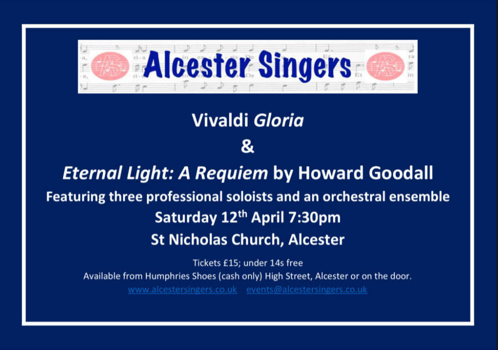 Vivaldi’s Gloria and Eternal Light: A Requiem by Howard Goodall Featuring three professional soloists and orchestral ensemble Tickets are £15 and available from Humphries Shoes, High Street, Alcester (cash only), choir members, by contacting alcestersingers@events.co.uk or on the door