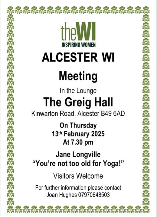 AlcesterAlauna Event Details Date: 13/02/2025 7:30 pm – 10:00 pm Venue: The Greig HallTicket Price: Contact name: Telephone: Email: Category: Womens Institute