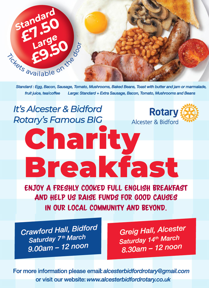 Come and enjoy a scrumptious cooked breakfast and support local causes too with Alcester & Bidford Rotary’s Charity Big Breakfast on Saturday 14th March. Doors open at 8.30 am at the Greig Hall and we’re open until 12 noon. There will be a super raffle too ! There’s also the Bidford Charity Big Breakfast at Crawford Hall on Saturday 7th if you want to come to both!