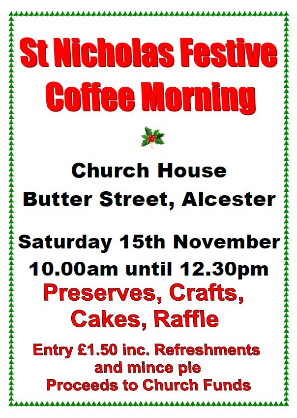 AlcesterAlauna Event Details Date: 15/11/2025 10:00 am – 12:30 pm Venue: Church HouseTicket Price: £1.50 inc refreshments & mince pieContact name: Telephone: Email: Category: St Nicholas Restoration Fund A Festive Coffee Morning with stalls of Preserves, Crafts, Cakes, and Raffle