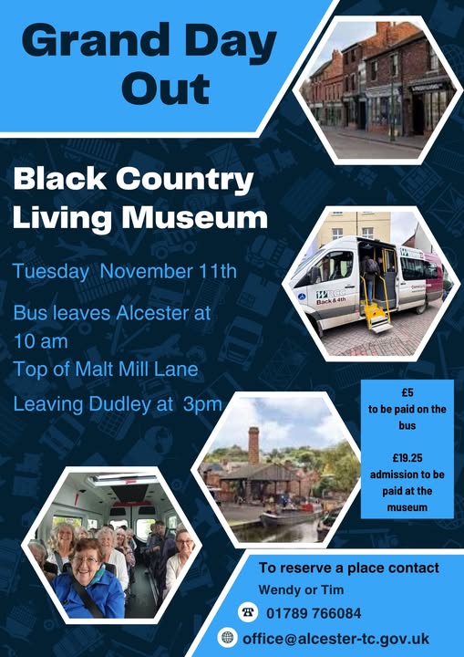 AlcesterAlauna Event Details Date: 11/11/2025 10:30 am – 3:00 pm Venue: Malt Mill LaneTicket Price: £5 for bus plus £19.25 museumContact name: Telephone: Email: Category: Alcester Town Council