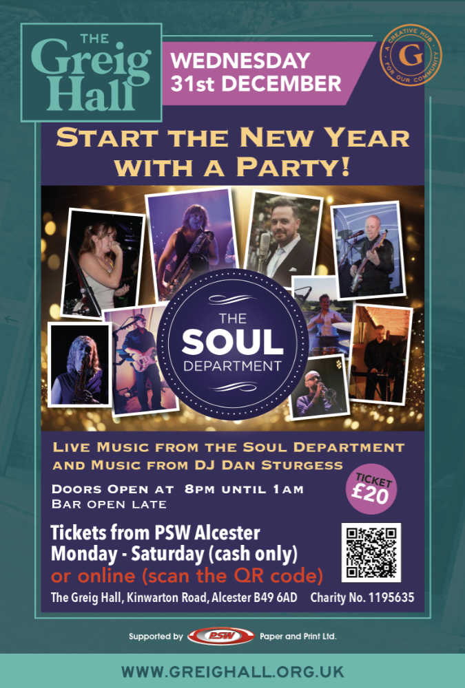 AlcesterAlauna Event Details Date: 31/12/2025 8:00 pm – 01/01/2026 1:00 am Venue: The Greig HallTicket Price: £20Contact name: Telephone: Email: Category: Greig Hall Fund Celebrate with live music from The Soul Department and music from DJ Danny.